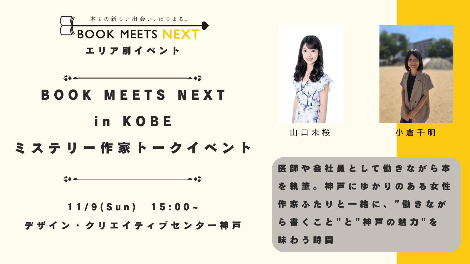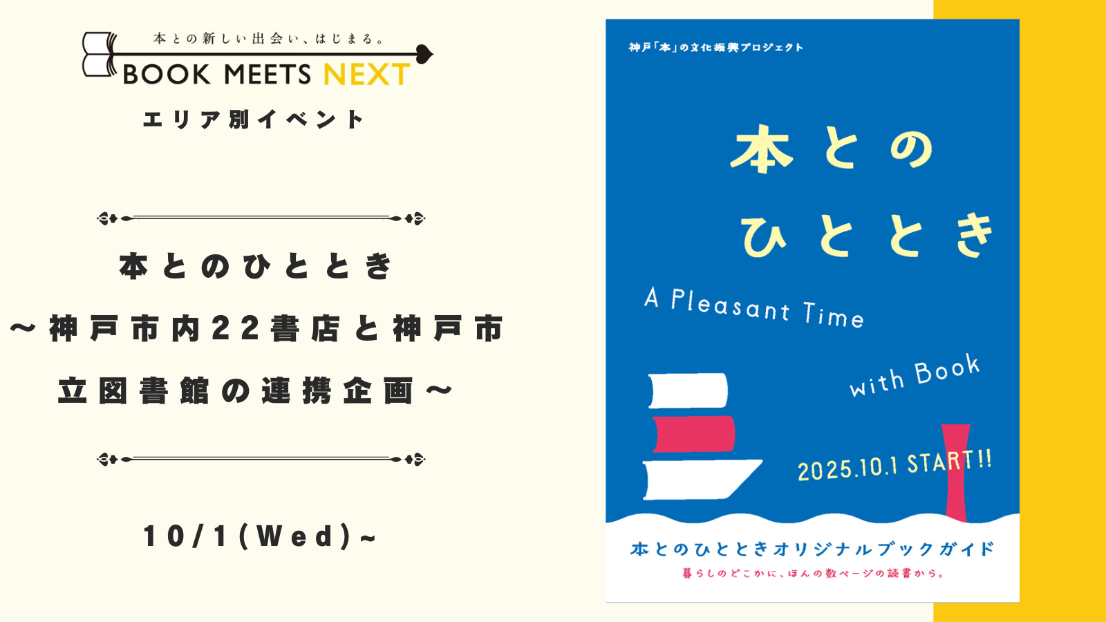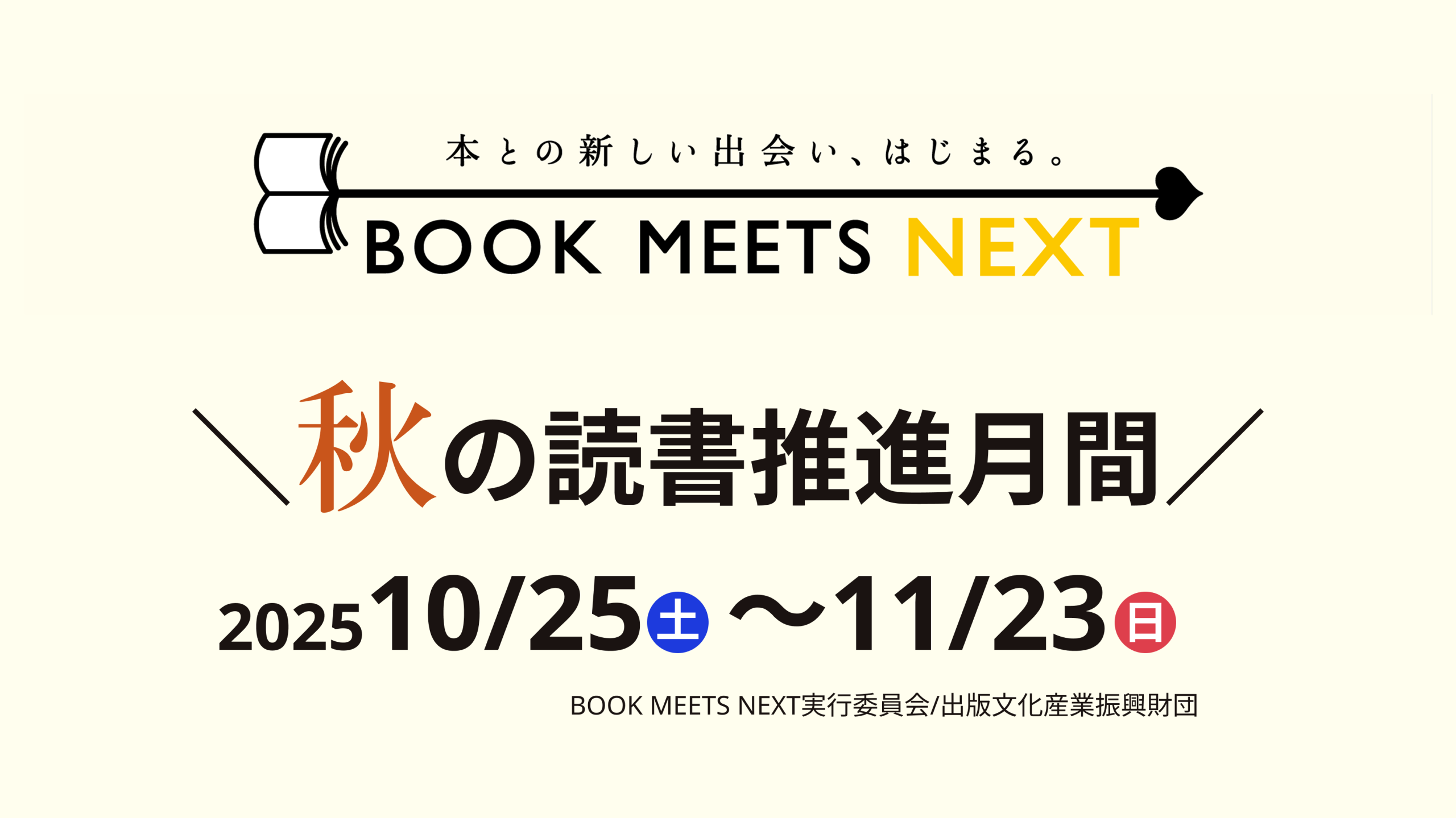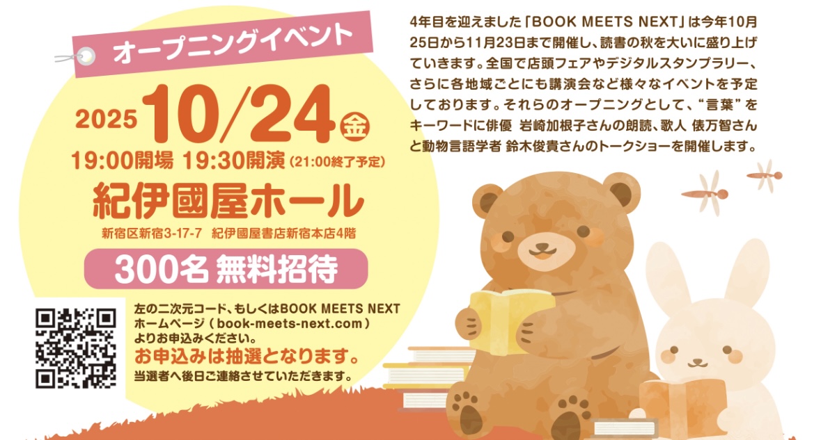 BOOK MEETS NEXTとは 本との新しい出会い、はじまる。 BOOK MEETS NEXTは「本との新しい出会い、はじまる」をスローガンに2022年よりスタートしたキャンペーン!多くの地域から書店がなくなり、本が読まれなくなったと言われているこの時代に「本が好きな人」をこれまで以上にワクワクさせ、一方で、まだまだ「本との距離感が遠い人」には魅力的な本との出会いを届ける仕掛けを出版業界が一丸となって実施しており、年間を通して様々な企画、イベントをおこなっています。 イベント案内 日付11月23日(日)時間14:00 〜 15:30 本が苦手な10代にどう届ける? ー読む・書くの入口をひらくー 本とのひととき~神戸市内22書店と神戸市立図書館の連携企画~ 日付10月25日(土) 「ブックカバーカプセル」10月25日より発売 日付11月3日(月・祝)時間14:00開演 スージー鈴木のブックンロール大賞 日付10月31日(金)時間20:00開演 〜 22:00終了予定 「読めるお酒」第3弾発売記念 町田そのこさんと味わう、お酒と文学 日付11月1日(土)時間14:00開演 〜 15:30イベント終了 17:00サイン会終了 鈴木のりたけ『きれてる』発売記念 トークライブ&ロールケーキパーティー イベント一覧を見る NEWS 2025年9月26日 キャンペーンサイトをリニューアルしました ニュース一覧を見る 全国の書店で開催するイベント一覧 キャンペーン期間中に開催しているイベントをご覧いただけます。最寄りの書店で開催するイベントをチェックしよう! 書店イベント一覧を見る(10/24 公開予定) 書店掲示物 BOOK MEETS NEXTのポスター・ロゴ等は下記よりダウンロードいただけます 詳しくはこちら 協賛企業 BOOK MEETS NEXTに協賛いただいた企業様は下記よりご確認いただけます 協賛企業一覧 キャンペーン公式SNS X(旧Twitter) 公式 YouTubeチャンネル 公式 LINE \ 協賛・取材のお問い合わせはこちら ⁄ お問い合わせ