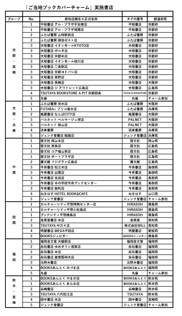日付10月25日(土) 「ブックカバーカプセル」10月25日より発売 全国20地域、計135書店で各書店のブックカバーのミニチュアブックを作成し、カプセルトイとして発売します! ▼販売書店一覧 ※「チャーム参加」とある書店は当該地域のカプセルトイにデザイン提供のみ行っており、域内の店舗での販売はございません。 ご了承ください。 ▼20地域の各ご当地ブックカバーチャーム一覧 back