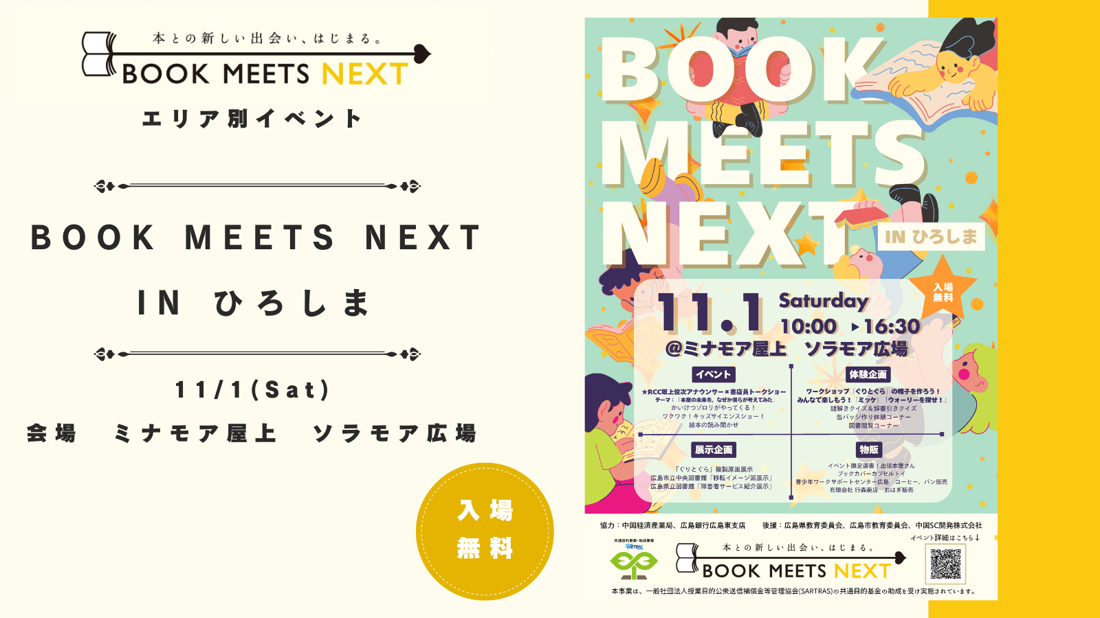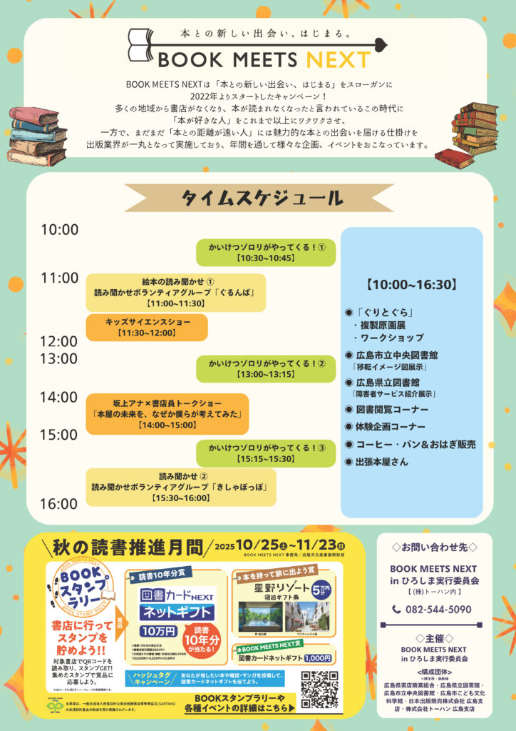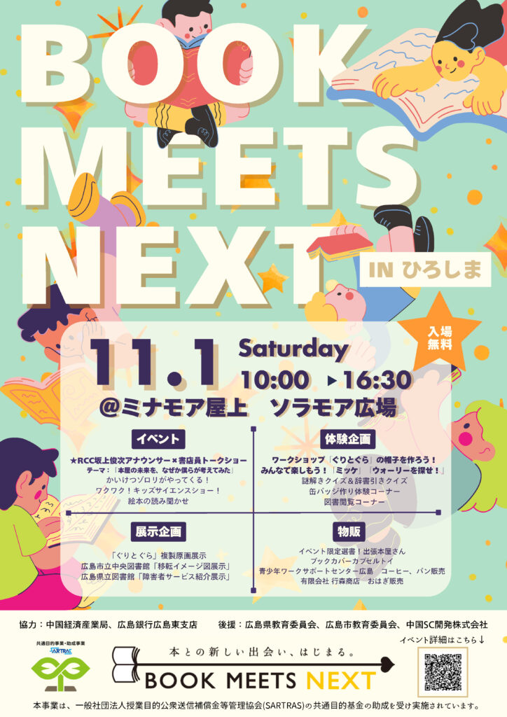 日付11月1日(土)時間10:00 〜 16:30場所ミナモア屋上 ソラモア広場 BOOK MEETS NEXT IN ひろしま 広島駅ビル商業施設ミナモア(minamoa)の屋上 東側9階にソラモア広場で本と新しく出会う。トークショーやワークショップ、複製原画展など盛りだくさん!出張本屋さんも登場!かいけつゾロリもやってくる!入場無料。◆トークショーなどイベントを開催!・RCC坂上俊次アナウンサー×書店員トークショー・かいけつゾロリがやってくる!・ワクワク!キッズサイエンスショー!・絵本の読み聞かせ◆体験企画も盛りだくさん!・ワークショップ「ぐりとぐら」の帽子を作ろう!・みんなで楽しもう!「ミッケ」「ウォーリーを探せ!」・謎解きクイズ&辞書引きクイズ・缶バッジ作り体験コーナー・図書閲覧コーナー◆さまざまな展示もおこないます・「ぐりとぐら」複製原画展示・広島市立中央図書館「移転イメージ図展示」・広島県立図書館「障害者サービス紹介展示」◆物販もあります!・イベント限定選書!出張本屋さん・ブックカバーカプセルトイ・青少年ワークサポートセンター広島 コーヒー、パン販売・有限会社 行森商店 おはぎ販売 back